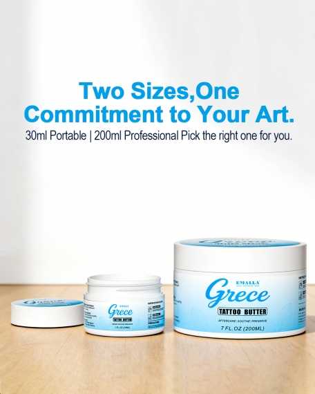 Emalla Grece Tattoo Butter is crafted for professional tattoo artists and enthusiasts. This plant-based, vegan formula deeply hydrates, strengthens the skin barrier, and promotes breathable, healthy healing. Suitable for fresh or existing tattoos, it soothes irritation, supports recovery, and helps maintain vibrant body art. The luxurious butter melts on contact, absorbs quickly, and leaves no greasy residue for a smooth, indulgent feel. Safe, skin-friendly, and free from mineral oils, fragrance, artificial colorants, harsh preservatives, and known high allergens, it’s gentle enough for sensitive skin and ideal for healing or daily tattoo care.